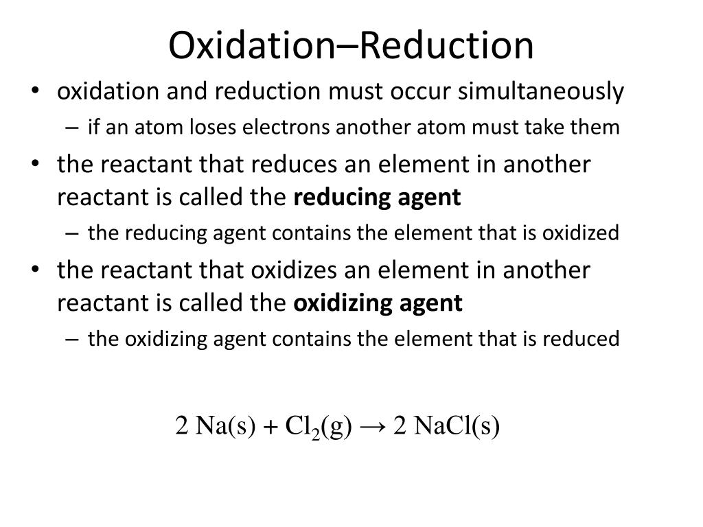 Oxidation–Reduction oxidation and reduction must occur simultaneously if an atom loses electrons another atom must take them the reactant that reduces an element in another reactant is called the reducing agent the reducing agent contains the element that is oxidized the reactant that oxidizes an element in another reactant is called the oxidizing agent the oxidizing agent contains the element that is reduced 2 Na(s) + Cl2(g) → 2 NaCl(s)