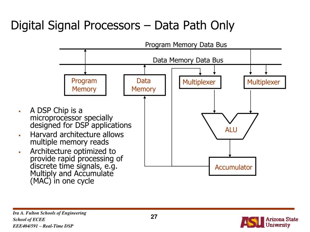 Digital Signal Processors – Data Path Only Accumulator Data Memory Program Memory Multiplexer Multiplexer • A DSP Chip is a microprocessor specially designed for DSP applications • Harvard architecture allows multiple memory reads • Architecture optimized to provide rapid processing of discrete time signals, e.g. Multiply and Accumulate (MAC) in one cycle Program Memory Data Bus Data Memory Data Bus ALU 27