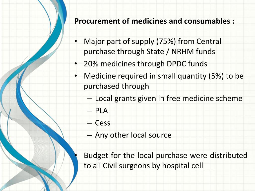 Procurement of medicines and consumables : • Major part of supply (75%) from Central purchase through State / NRHM funds • 20% medicines through DPDC funds • Medicine required in small quantity (5%) to be purchased through • Local grants given in free medicine scheme • PLA • Cess • Any other local source • Budget for the local purchase were distributed to all Civil surgeons by hospital cell