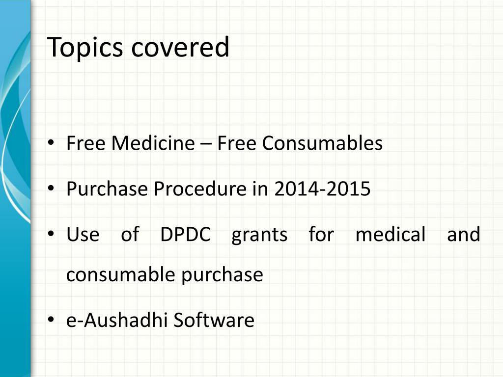 Topics covered • Free Medicine – Free Consumables • Purchase Procedure in 2014-2015 • Use of DPDC grants for medical and consumable purchase • e-Aushadhi Software