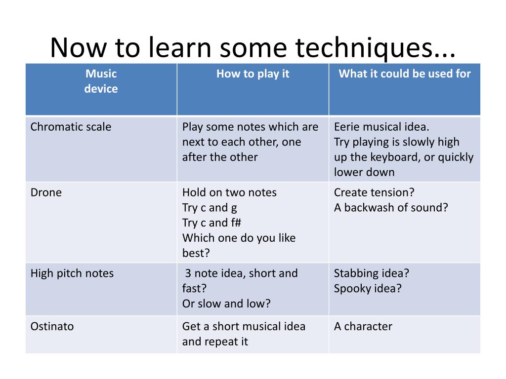 Preparation activity onelistening…. First of all you are going to listen to some scary music… The aim is to listen to what professional composers have done to create an atmosphere so that you can use the same ideas in your scary music.