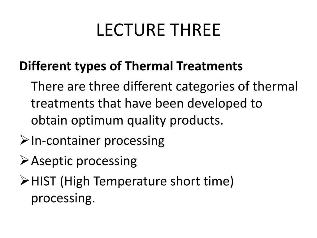 LECTURE THREE Different types of Thermal Treatments There are three different categories of thermal treatments that have been developed to obtain optimum quality products. • In-container processing • Aseptic processing • HIST (High Temperature short time) processing.