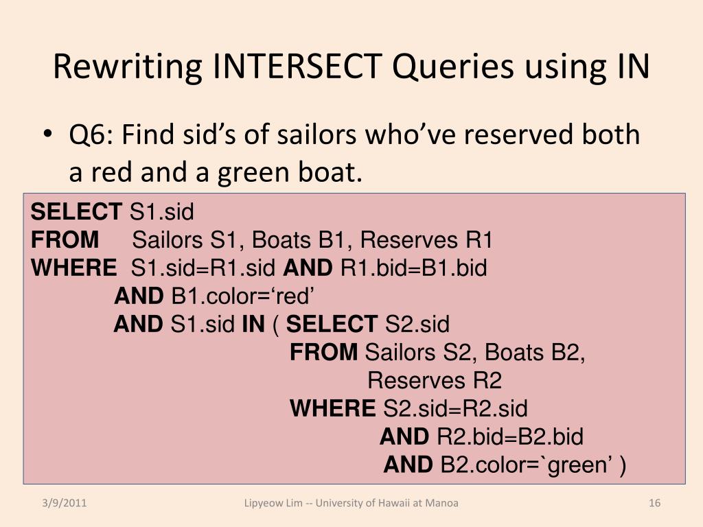 Rewriting INTERSECT Queries using IN • Q6: Find sid’s of sailors who’ve reserved both a red and a green boat. SELECT S1.sid FROM Sailors S1, Boats B1, Reserves R1 WHERE S1.sid=R1.sid AND R1.bid=B1.bid AND B1.color=‘red’ AND S1.sid IN ( SELECT S2.sid FROM Sailors S2, Boats B2, Reserves R2 WHERE S2.sid=R2.sid AND R2.bid=B2.bid AND B2.color=`green’ ) Lipyeow Lim -- University of Hawaii at Manoa