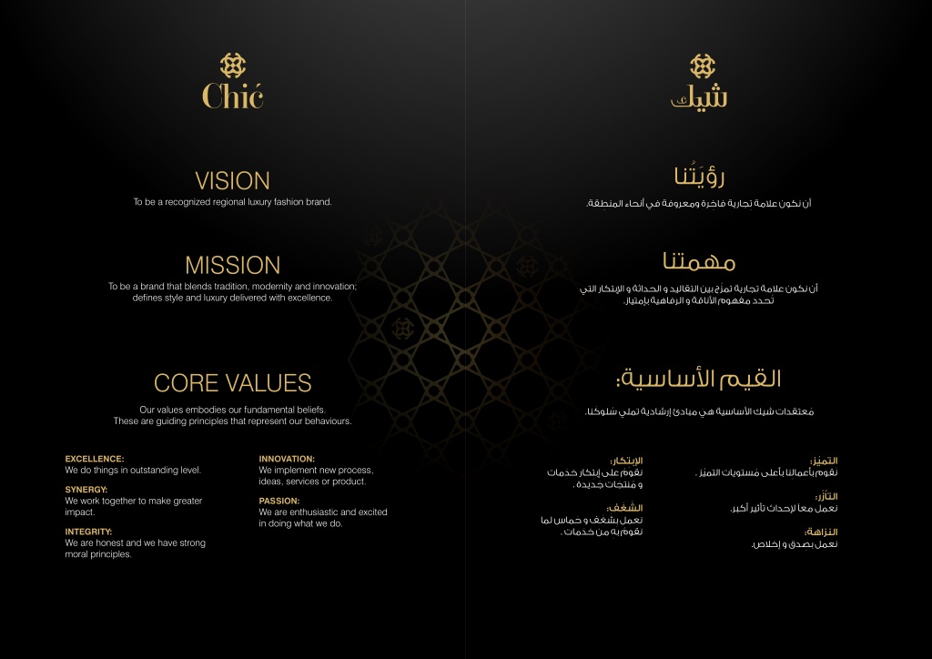 ﺎﻨُﺘَﻳؤر VISION To be a recognized regional luxury fashion brand. .ﺔﻘ ِ ﻄﻨﻤﻟا ءﺎﺤﻧأ ﻲﻓ ﺔﻓوﺮﻌﻣو ةﺮ ِ ﺧﺎﻓ ﺔﻳرﺎﺠِﺗ ﺔﻣﻼﻋ نﻮﻜﻧ نأ ﺎﻨﺘﻤﻬﻣ MISSION To be a brand that blends tradition, modernity and innovation; defines style and luxury delivered with excellence. ﻲﺘﻟا رﺎﻜﺘﺑ?ا و ﺔﺛاﺪﺤﻟا و ﺪﻴﻟﺎﻘﺘﻟا ﻦﻴﺑ جُﺰﻤﺗ ﺔﻳرﺎﺠﺗ ﺔﻣﻼﻋ نﻮﻜﻧ نأ .زﺎﻴﺘﻣﺈﺑ ﺔﻴﻫﺎﻓﺮﻟا و ﺔﻗﺎﻧ?ا مﻮﻬﻔﻣ دﺪﺤُﺗ :ﺔﻴﺳﺎﺳ?ا ﻢﻴﻘﻟا CORE VALUES Our values embodies our fundamental beliefs. These are guiding principles that represent our behaviours. .ﺎﻨَﻛﻮﻠ ُ ﺳ ﻲﻠﻤﺗ ﺔﻳدﺎﺷرإ ئدﺎﺒﻣ َﻲﻫ ﺔﻴﺳﺎﺳ?ا ﻚﻴﺷ تاﺪﻘﺘﻌُﻣ EXCELLENCE: We do things in outstanding level. INNOVATION: We implement new process, ideas, services or product. :رﺎﻜِﺘﺑ?ا :ﺰُﻴﻤﺘﻟا تﺎﻣ َ ﺪﺧ رﺎﻜِﺘﺑإ ﻰﻠﻋ ُ مﻮﻘﻧ . ةﺪﻳﺪ َ ﺟ تﺎ َ ﺠﺘﻨُﻣ و . ﺰُﻴﻤﺘﻟا تﺎﻳﻮﺘﺴُﻣ ﻰﻠﻋﺄﺑ ﺎﻨِﻟﺎﻤﻋﺄﺑ مﻮﻘَﻧ SYNERGY: We work together to make greater impact. :رُزّﺎﺘﻟا PASSION: We are enthusiastic and excited in doing what we do. :ﻒَﻐَﺸﻟا .ﺮﺒﻛأ ﺮﻴﺛﺄﺗ ثاﺪﺣ? ?ﻌﻣ ﻞﻤﻌﻧ ﺎﻤﻟ سﺎﻤ َ ﺣ و ﻒَﻐَﺸِﺑ ﻞﻤﻌﻧ . تﺎﻣ َ ﺪﺧ ﻦﻣ ِ ﻪﺑ ُ مﻮﻘﻧ :ﺔﻫاﺰﻨﻟا INTEGRITY: We are honest and we have strong moral principles. .صﻼﺧإ و قﺪ ِ ﺼﺑ ﻞﻤﻌﻧ