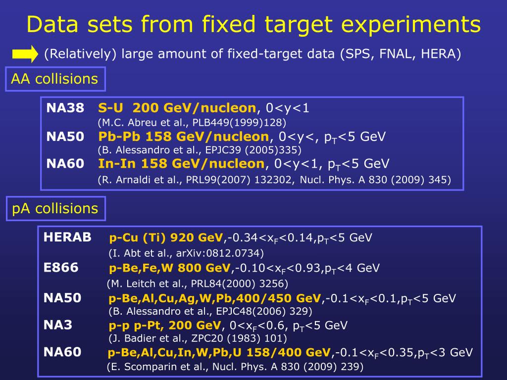 Data sets from fixed target experiments (Relatively) large amount of fixed-target data (SPS, FNAL, HERA) AA collisions NA38S-U 200 GeV/nucleon, 0<y<1 (M.C. Abreu et al., PLB449(1999)128) NA50Pb-Pb 158 GeV/nucleon, 0<y<, pT<5 GeV (B. Alessandro et al., EPJC39 (2005)335) NA60In-In 158 GeV/nucleon, 0<y<1, pT<5 GeV (R. Arnaldi et al., PRL99(2007) 132302,Nucl. Phys. A 830 (2009) 345) pA collisions HERABp-Cu (Ti) 920 GeV,-0.34<xF<0.14,pT<5 GeV (I. Abt et al., arXiv:0812.0734) E866p-Be,Fe,W 800 GeV,-0.10<xF<0.93,pT<4 GeV (M. Leitch et al., PRL84(2000) 3256) NA50p-Be,Al,Cu,Ag,W,Pb,400/450 GeV,-0.1<xF<0.1,pT<5 GeV (B. Alessandro et al., EPJC48(2006) 329) NA3p-p p-Pt, 200 GeV, 0<xF<0.6, pT<5 GeV (J. Badier et al., ZPC20 (1983) 101) NA60p-Be,Al,Cu,In,W,Pb,U 158/400 GeV,-0.1<xF<0.35,pT<3 GeV (E. Scomparin et al., Nucl. Phys. A 830 (2009) 239)
