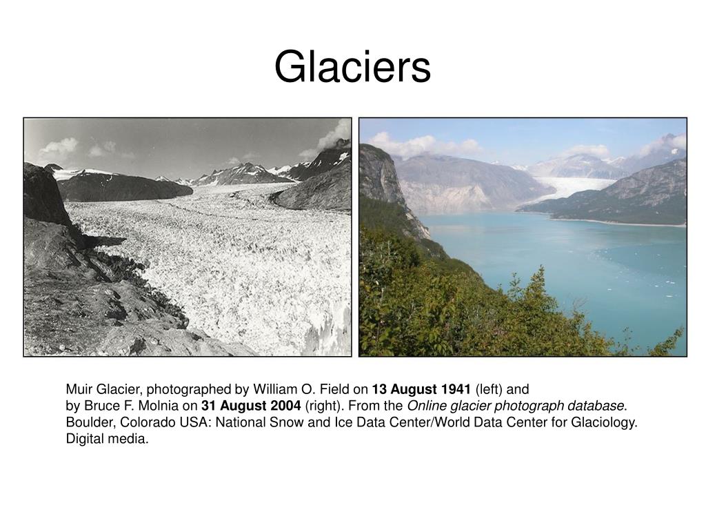 Glaciers Muir Glacier, photographed by William O. Field on 13 August 1941 (left) and by Bruce F. Molnia on 31 August 2004 (right).From the Online glacier photograph database. Boulder, Colorado USA: National Snow and Ice Data Center/World Data Center for Glaciology. Digital media.