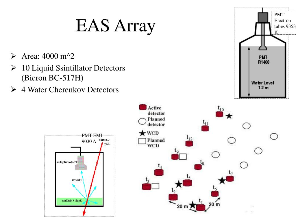 PMT Electron tubes 9353 K EAS Array • Area: 4000 m^2 • 10 Liquid Ssintillator Detectors (Bicron BC-517H) • 4 Water Cherenkov Detectors PMT EMI 9030 A