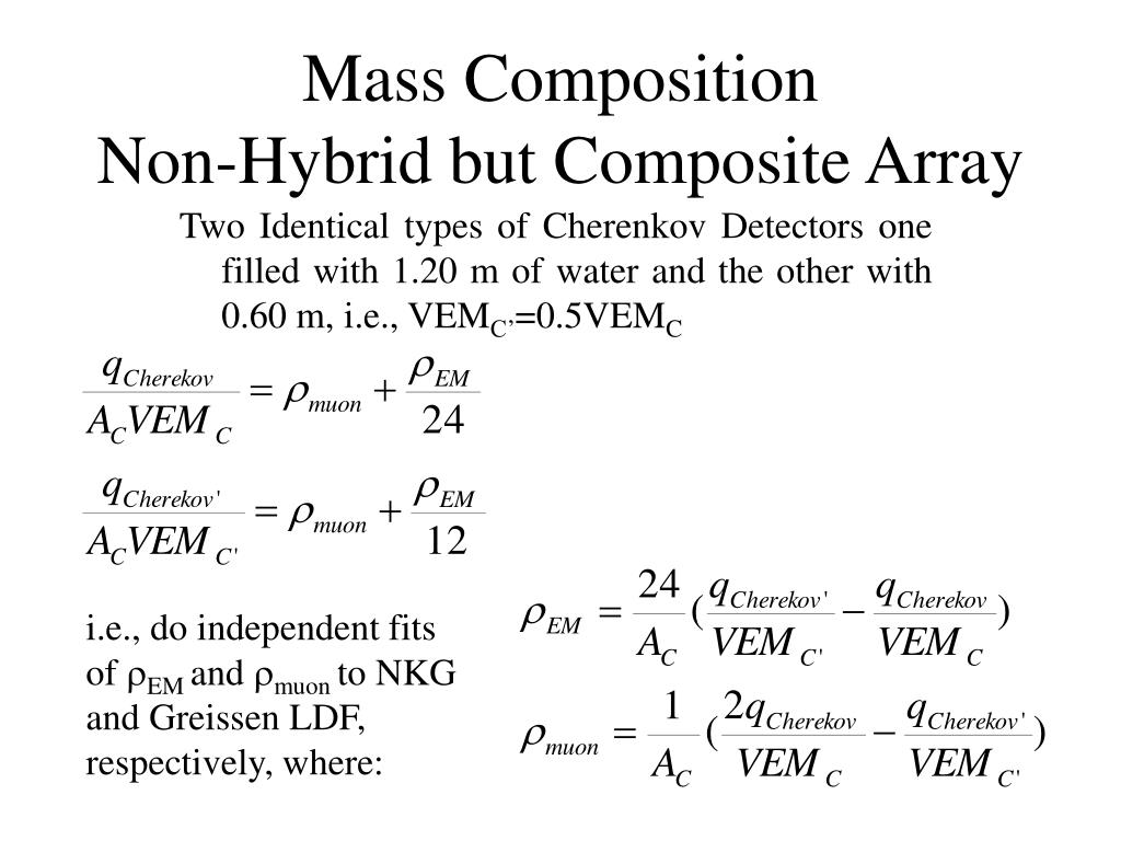 Two Identical types of Cherenkov Detectors one filled with 1.20 m of water and the other with 0.60 m, i.e., VEMC’=0.5VEMC Mass CompositionNon-Hybrid but Composite Array i.e., do independent fits of rEM and rmuon to NKG and Greissen LDF, respectively, where: