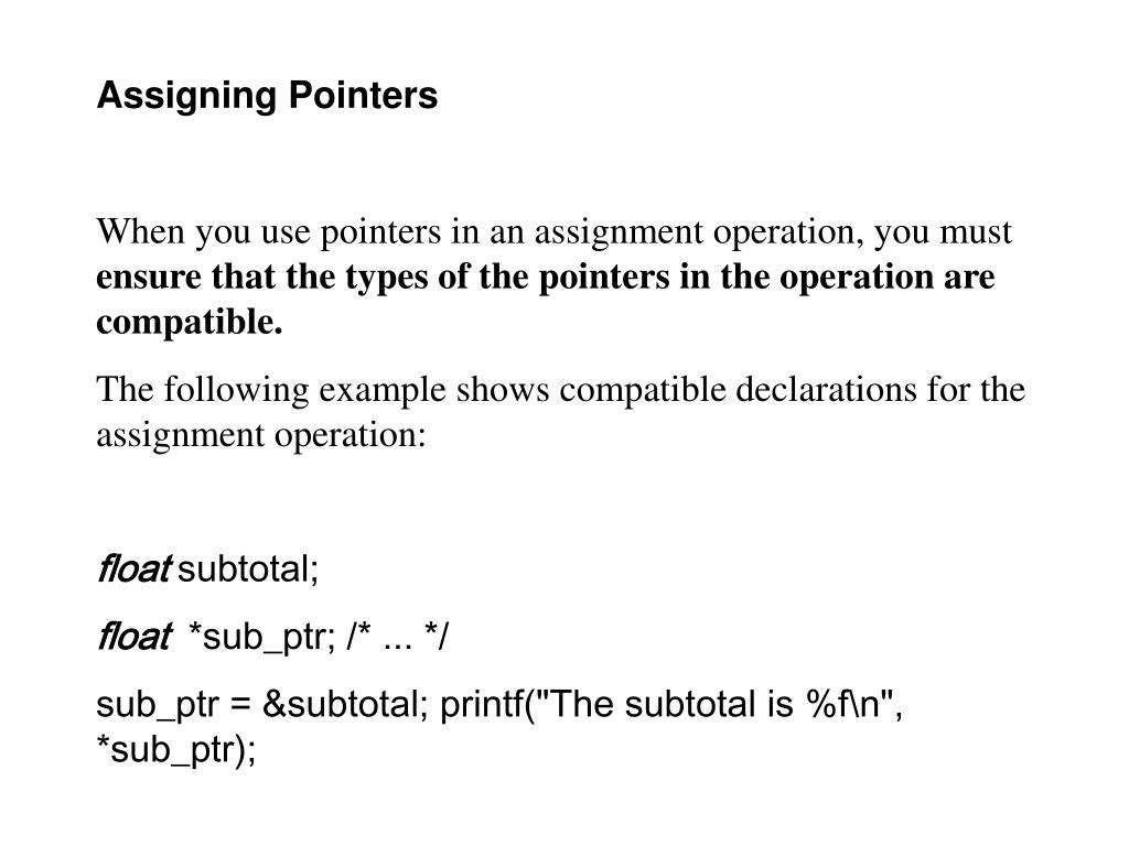 Assigning Pointers When you use pointers in an assignment operation, you must ensure that the types of the pointers in the operation are compatible. The following example shows compatible declarations for the assignment operation: float subtotal; float *sub_ptr; /* ... */ sub_ptr = &subtotal; printf("The subtotal is %f\n", *sub_ptr);