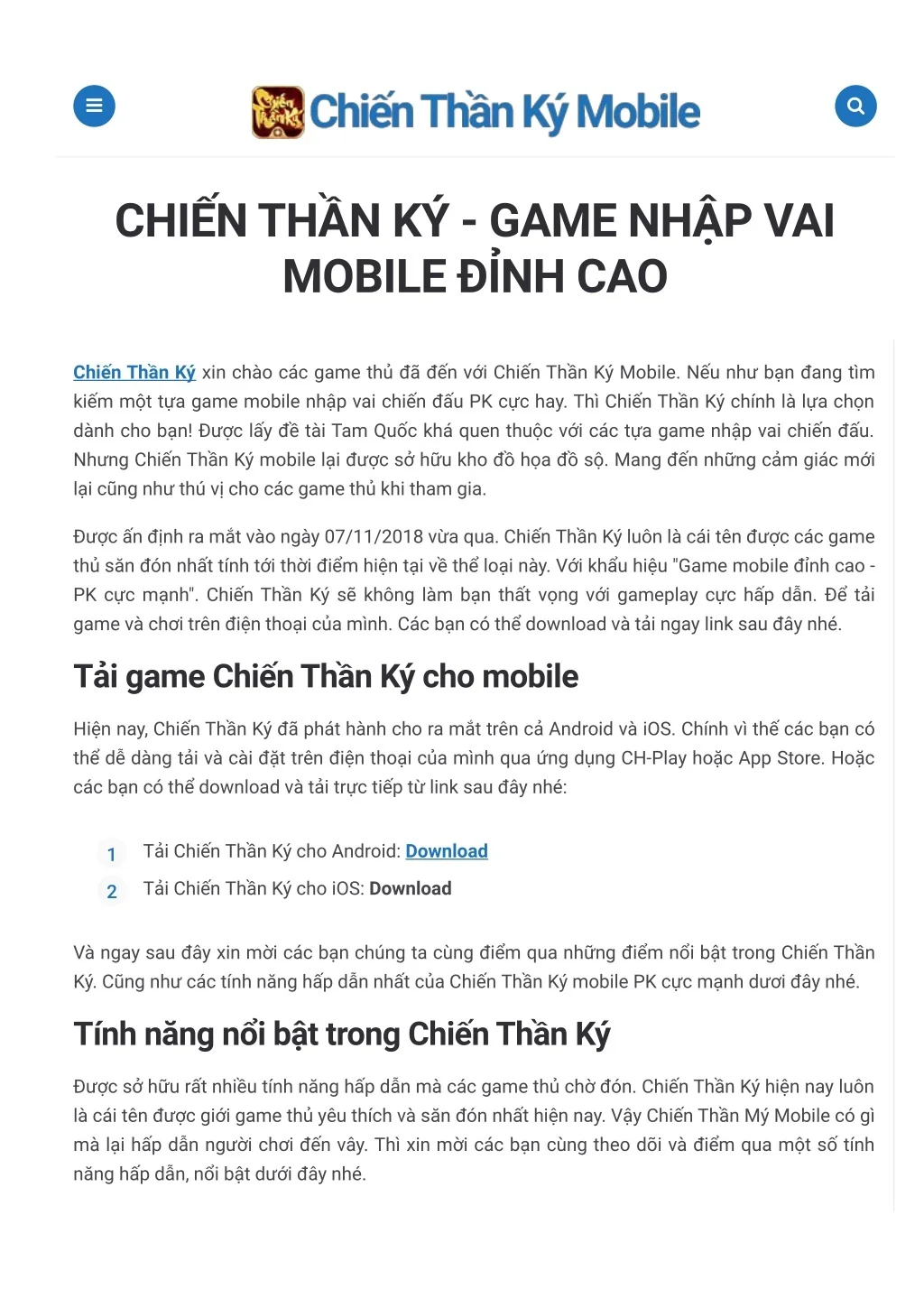 CHIẾN THẦN KÝ - GAME NHẬP VAI MOBILE ĐỈNH CAO Chiến Thần Ký xin chào các game thủđã đến với Chiến Thần Ký Mobile. Nếu như bạn đang tìm kiếm một tựa game mobile nhập vai chiến đấu PK cực hay. Thì Chiến Thần Ký chính là lựa chọn dành cho bạn! Được lấy đề tài Tam Quốc khá quen thuộc với các tựa game nhập vai chiến đấu. Nhưng Chiến Thần Ký mobile lại được sở hữu kho đồ họa đồ sộ. Mang đến những cảm giác mới lại cũng như thú vị cho các game thủ khi tham gia. Được ấn định ra mắt vào ngày 07/11/2018 vừa qua. Chiến Thần Ký luôn là cái tên được các game thủ săn đón nhất tính tới thời điểm hiện tại về thể loại này. Với khẩu hiệu "Game mobile đỉnh cao - PK cực mạnh". Chiến Thần Ký sẽ không làm bạn thất vọng với gameplay cực hấp dẫn. Để tải game và chơi trên điện thoại của mình. Các bạn có thể download và tải ngay link sau đây nhé. Tải game Chiến Thần Ký cho mobile Hiện nay, Chiến Thần Ký đã phát hành cho ra mắt trên cả Android và iOS. Chính vì thế các bạn có thể dễ dàng tải và cài đặt trên điện thoại của mình qua ứng dụng CH-Play hoặc App Store. Hoặc các bạn có thể download và tải trực tiếp từ link sau đây nhé: Tải Chiến Thần Ký cho Android: Download 1 Tải Chiến Thần Ký cho iOS: Download 2 Và ngay sau đây xin mời các bạn chúng ta cùng điểm qua những điểm nổi bật trong Chiến Thần Ký. Cũng như các tính năng hấp dẫn nhất của Chiến Thần Ký mobile PK cực mạnh dươi đây nhé. Tính năng nổi bật trong Chiến Thần Ký Được sở hữu rất nhiều tính năng hấp dẫn mà các game thủ chờđón. Chiến Thần Ký hiện nay luôn là cái tên được giới game thủ yêu thích và săn đón nhất hiện nay. Vậy Chiến Thần Mý Mobile có gì mà lại hấp dẫn người chơi đến vây. Thì xin mời các bạn cùng theo dõi và điểm qua một số tính năng hấp dẫn, nổi bật dưới đây nhé.