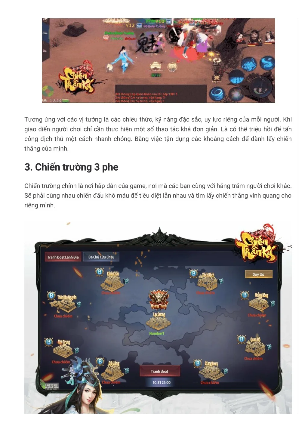 Tương ứng với các vị tướng là các chiêu thức, kỹ năng đặc sắc, uy lực riêng của mỗi người. Khi giao diến người chơi chỉ cần thực hiện một số thao tác khá đơn giản. Là có thể triệu hồi để tấn công địch thủ một cách nhanh chóng. Bằng việc tận dụng các khoảng cách để dành lấy chiến thắng của mình. 3. Chiến trường 3 phe Chiến trường chính là nơi hấp dẫn của game, nơi mà các bạn cùng với hằng trăm người chơi khác. Sẽ phải cùng nhau chiến đấu khô máu để tiêu diệt lẫn nhau và tìm lấy chiến thắng vinh quang cho riêng mình.