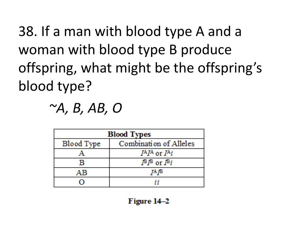 38. If a man with blood type A and a woman with blood type B produce offspring, what might be the offspring’s blood type? ~A, B, AB, O