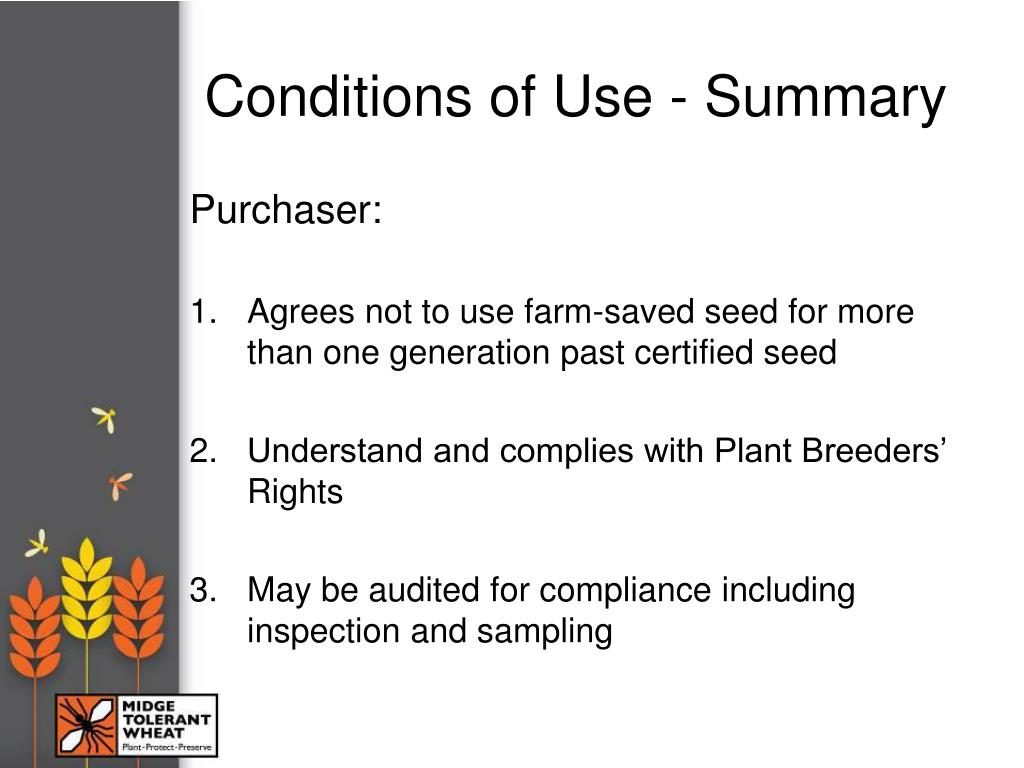 Conditions of Use - Summary Purchaser: • Agrees not to use farm-saved seed for more than one generation past certified seed • Understand and complies with Plant Breeders’ Rights • May be audited for compliance including inspection and sampling