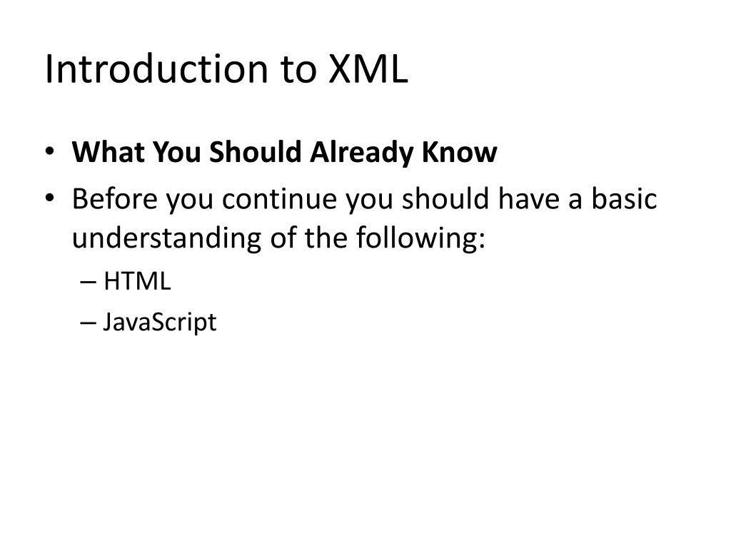Introduction to XML • What You Should Already Know • Before you continue you should have a basic understanding of the following: • HTML • JavaScript