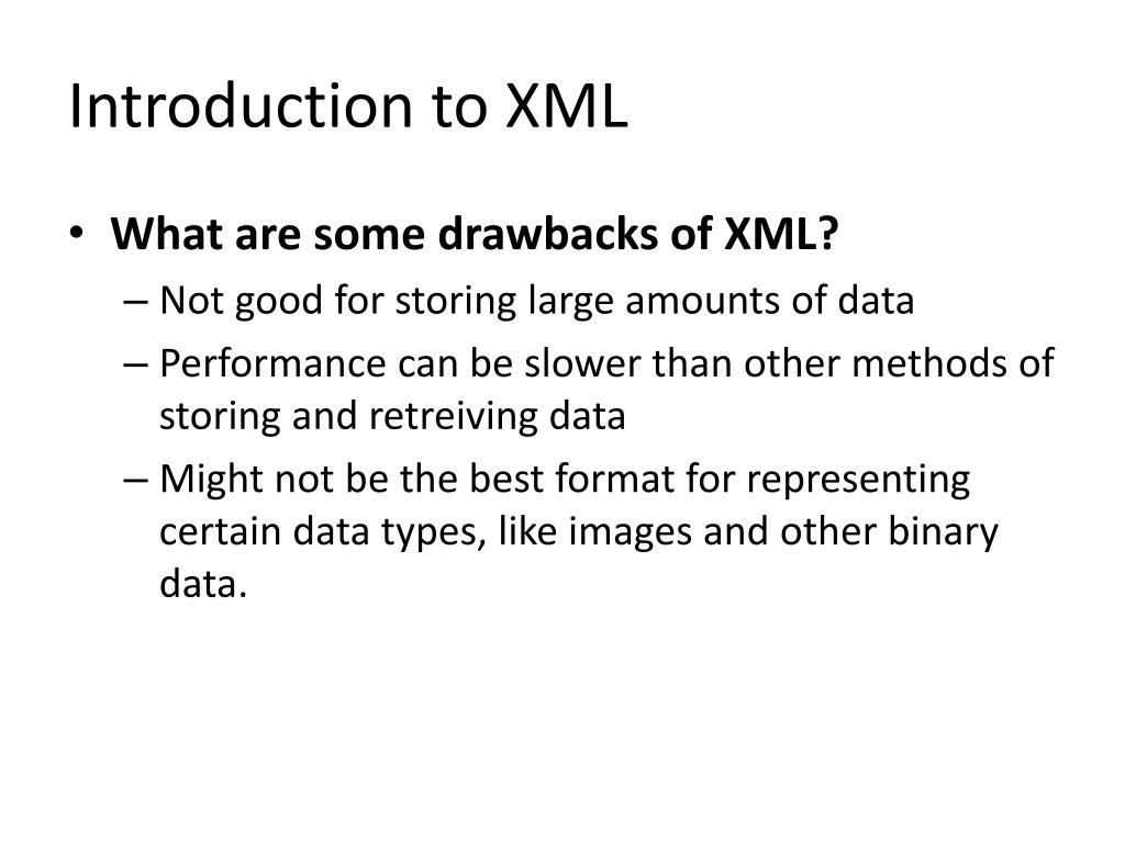 Introduction to XML • What are some drawbacks of XML? • Not good for storing large amounts of data • Performance can be slower than other methods of storing and retreiving data • Might not be the best format for representing certain data types, like images and other binary data.