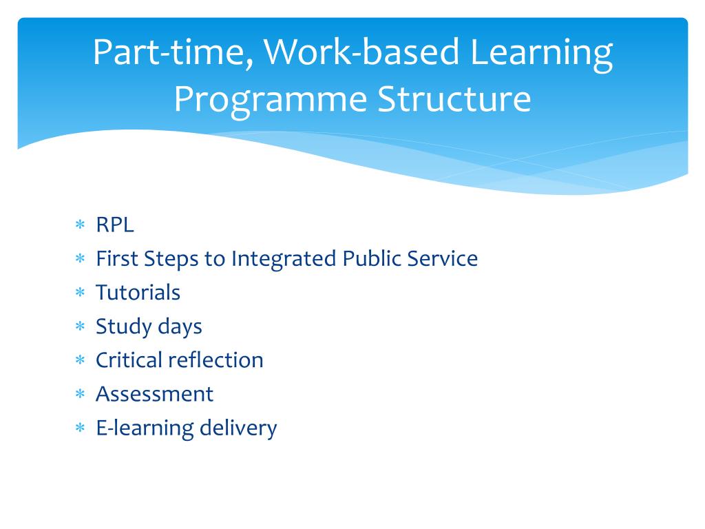 Part-time, Work-based Learning Programme Structure RPL First Steps to Integrated Public Service Tutorials Study days Critical reflection Assessment E-learning delivery