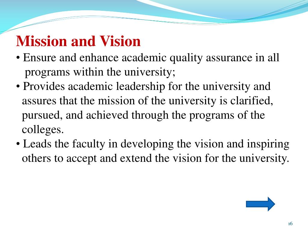 Mission and Vision • Ensure and enhance academic quality assurance in all • programs within the university; • Provides academic leadership for the university and • assures that the mission of the university is clarified, • pursued, and achieved through the programs of the • colleges. • Leads the faculty in developing the vision and inspiring • others to accept and extend the vision for the university.