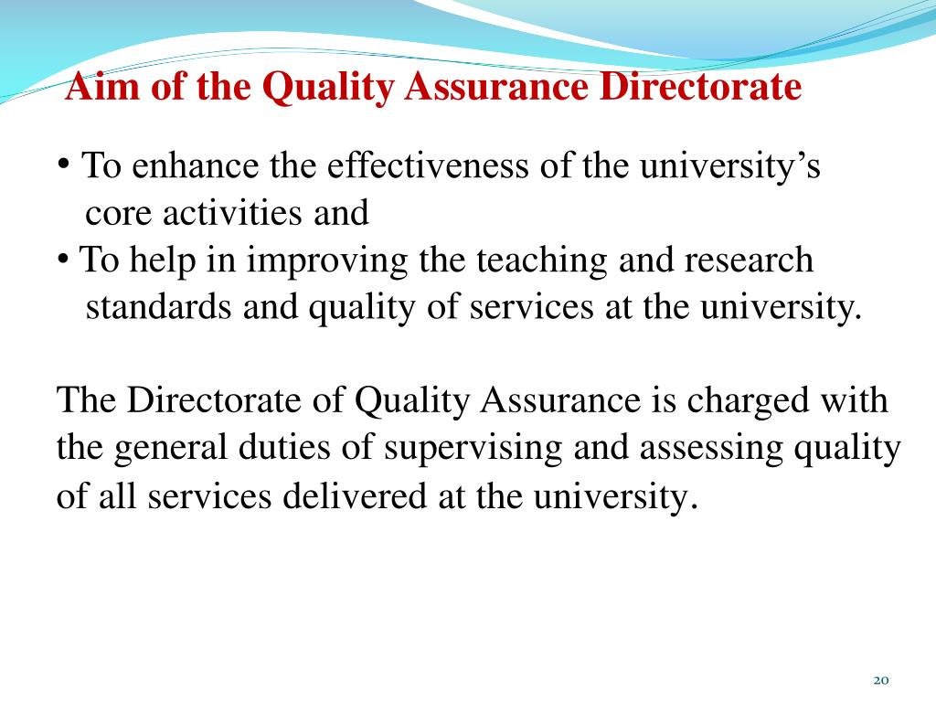 Aim of the Quality Assurance Directorate • To enhance the effectiveness of the university’s • core activities and • To help in improving the teaching and research • standards and quality of services at the university. • The Directorate of Quality Assurance is charged with the general duties of supervising and assessing quality of all services delivered at the university.