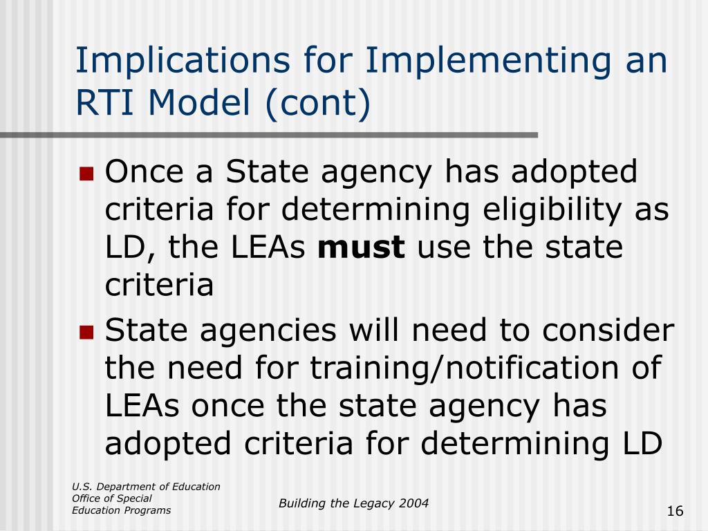 Implications for Implementing an RTI Model (cont) • Once a State agency has adopted criteria for determining eligibility as LD, the LEAs must use the state criteria • State agencies will need to consider the need for training/notification of LEAs once the state agency has adopted criteria for determining LD Building the Legacy 2004