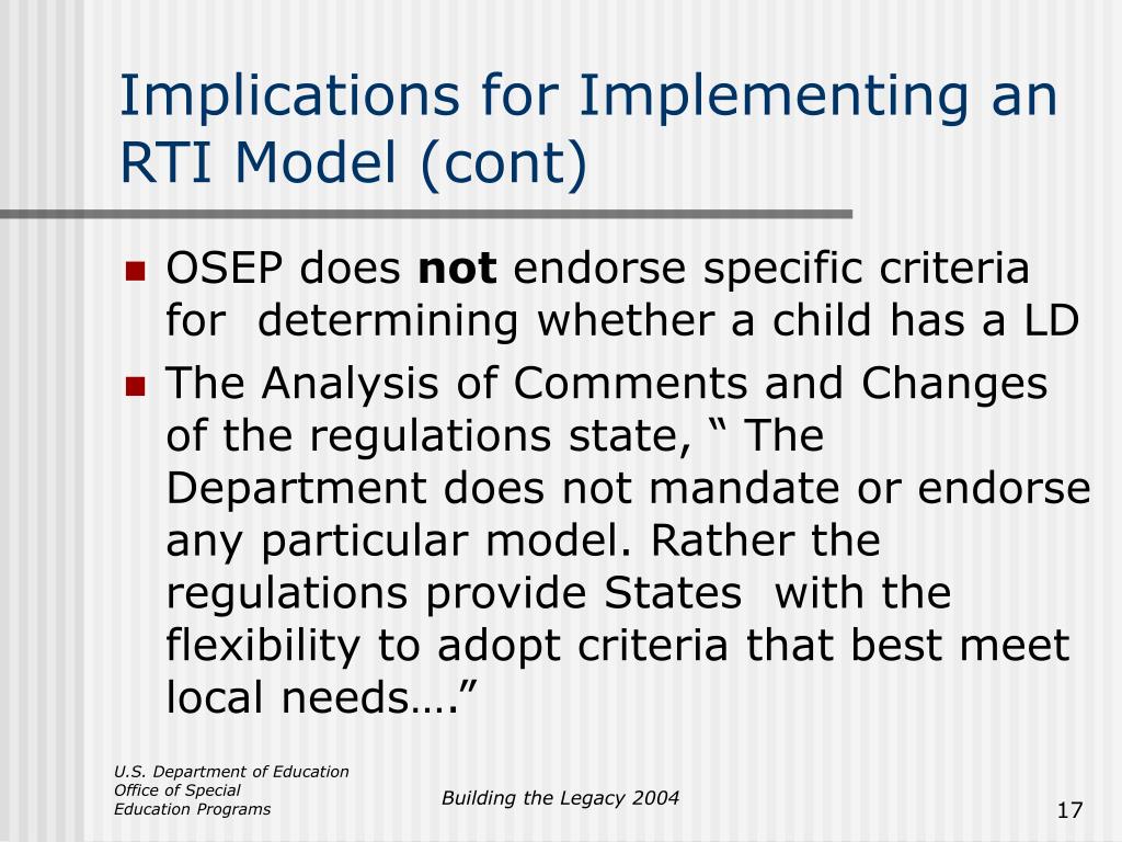 Implications for Implementing an RTI Model (cont) • OSEP does not endorse specific criteria for determining whether a child has a LD • The Analysis of Comments and Changesof the regulations state, “ The Department does not mandate or endorse any particular model. Rather the regulations provide States with the flexibility to adopt criteria that best meet local needs….” Building the Legacy 2004