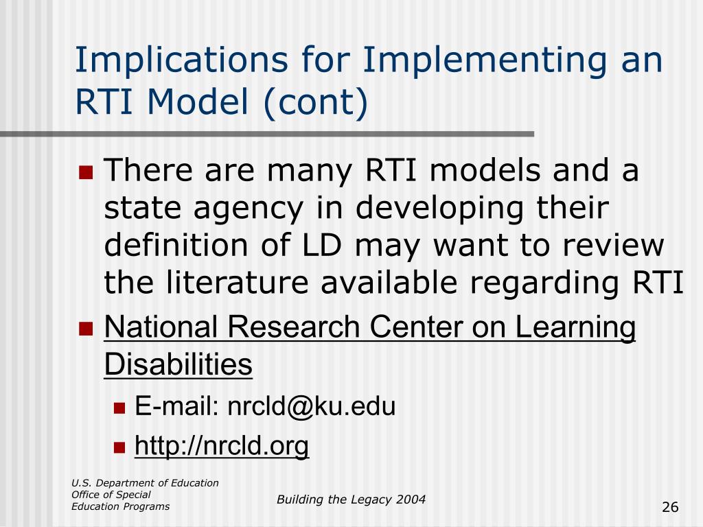 Implications for Implementing an RTI Model (cont) • There are many RTI models and a state agency in developing their definition of LD may want to review the literature available regarding RTI • National Research Center on Learning Disabilities • E-mail: nrcld@ku.edu • http://nrcld.org Building the Legacy 2004
