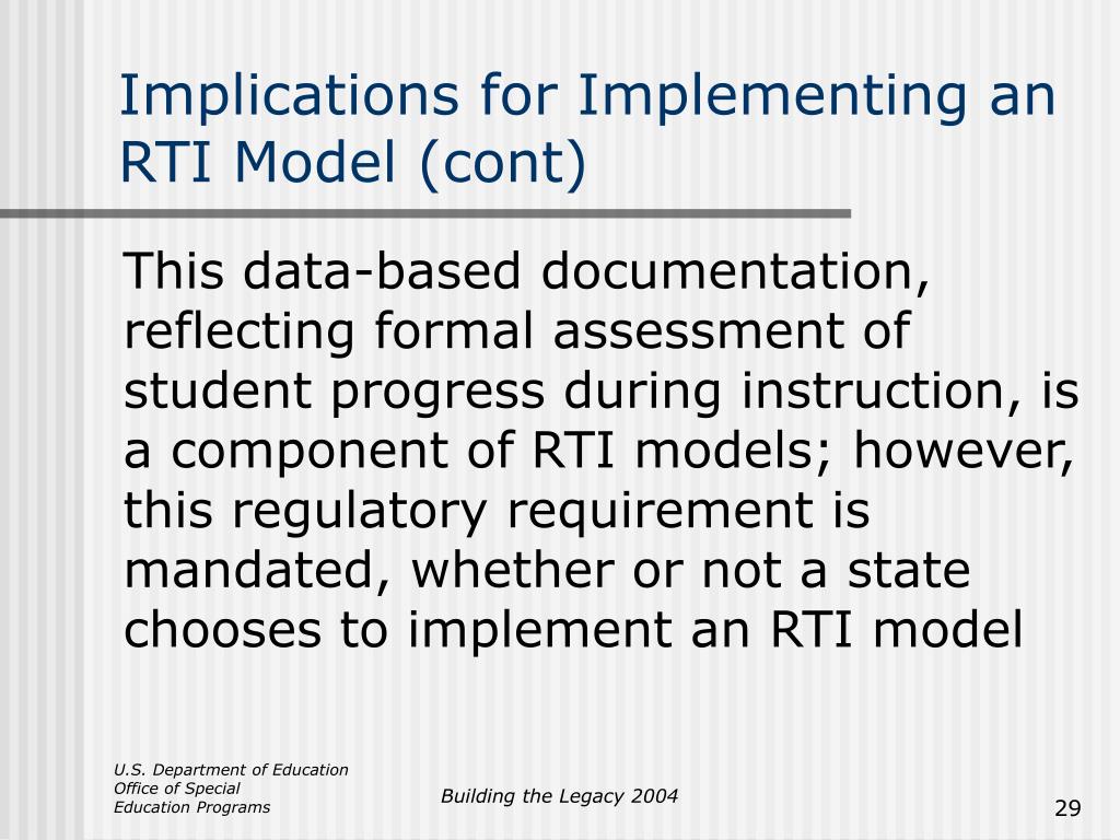 Implications for Implementing an RTI Model (cont) This data-based documentation, reflecting formal assessment of student progress during instruction, is a component of RTI models; however, this regulatory requirement is mandated, whether or not a state chooses to implement an RTI model Building the Legacy 2004