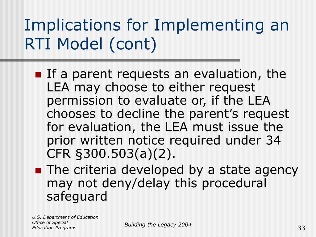Implications for Implementing an RTI Model (cont) • If a parent requests an evaluation, the LEA may choose to either request permission to evaluate or, if the LEA chooses to decline the parent’s request for evaluation, the LEA must issue the prior written notice required under 34 CFR §300.503(a)(2). • The criteria developed by a state agency may not deny/delay this procedural safeguard Building the Legacy 2004