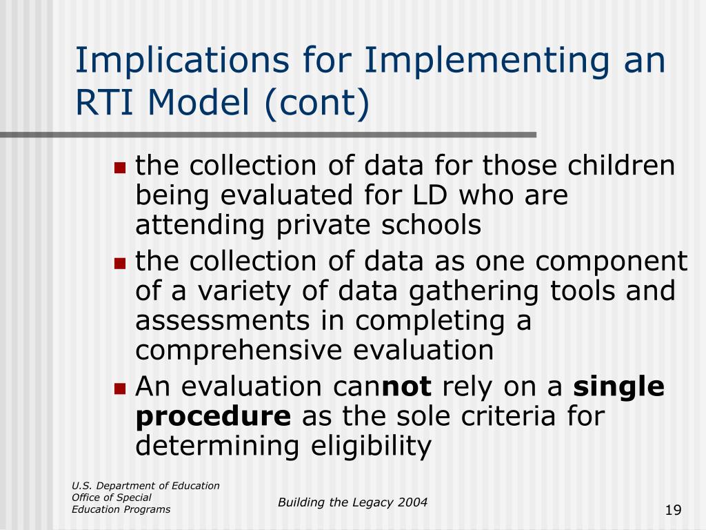 Implications for Implementing an RTI Model (cont) • the collection of data for those children being evaluated for LD who are attending private schools • the collection of data as one component of a variety of data gathering tools and assessments in completing a comprehensive evaluation • An evaluation cannot rely on a single procedure as the sole criteria for determining eligibility Building the Legacy 2004