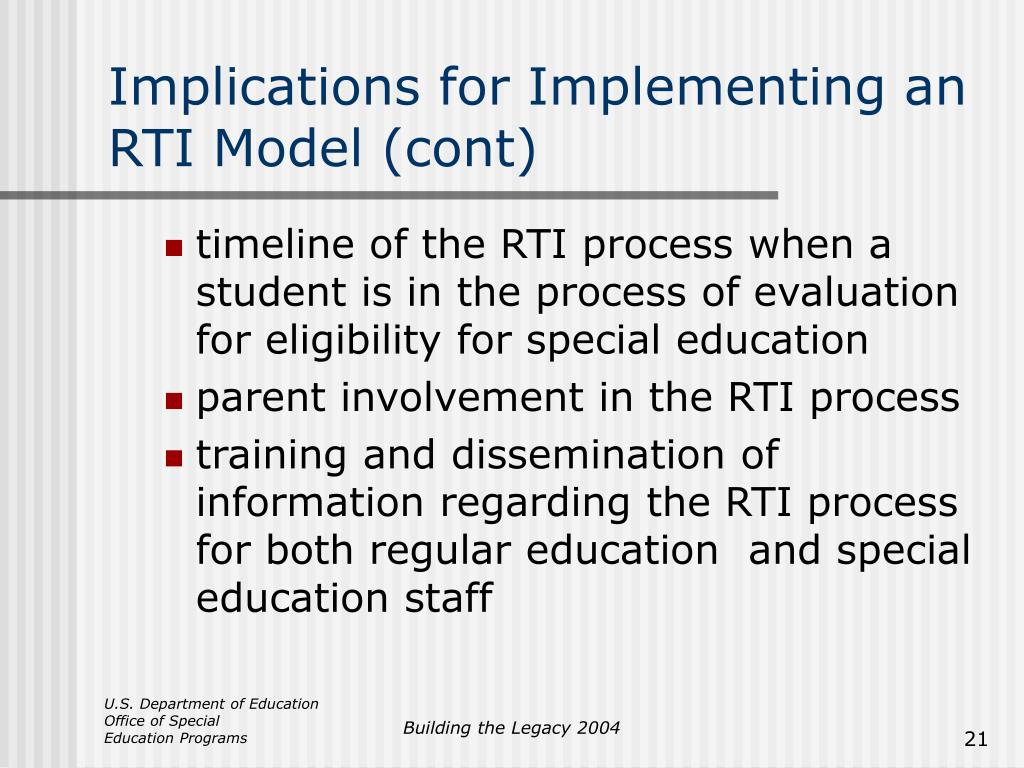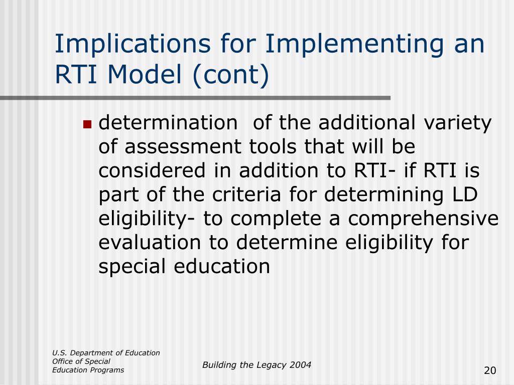 Implications for Implementing an RTI Model (cont) • determination of the additional variety of assessment tools that will be considered in addition to RTI- if RTI is part of the criteria for determining LD eligibility- to complete a comprehensive evaluation to determine eligibility for special education Building the Legacy 2004