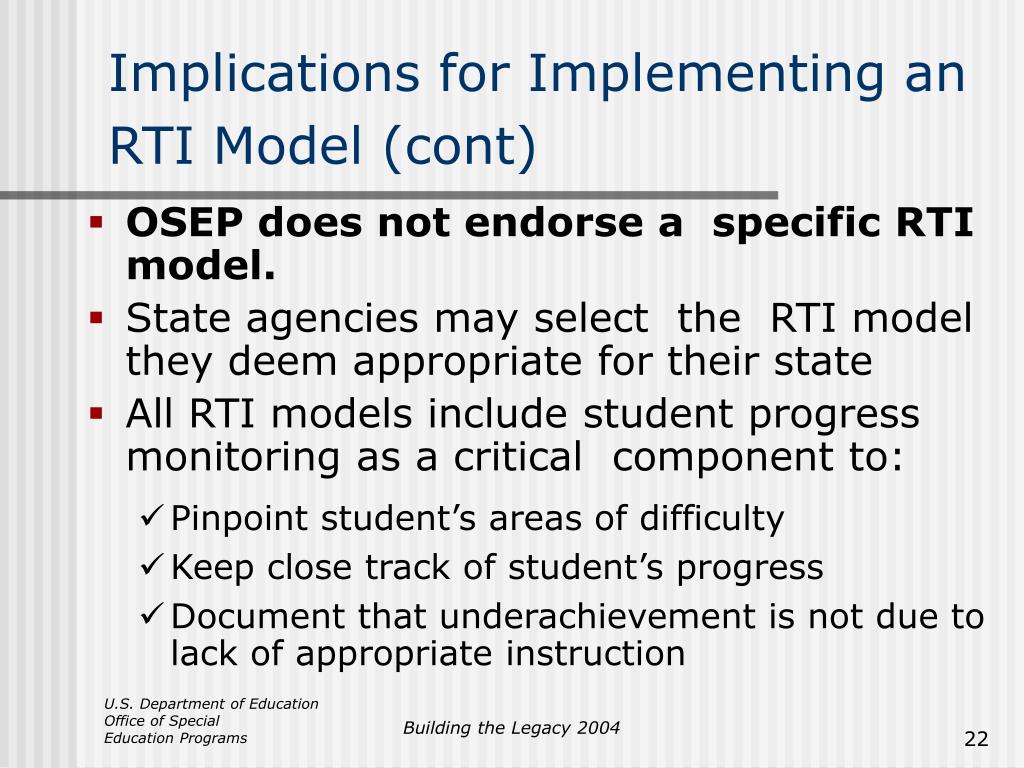 Implications for Implementing an RTI Model (cont) • OSEP does not endorse a specific RTI model. • State agencies may select the RTI model they deem appropriate for their state • All RTI models include student progress monitoring as a critical component to: • Pinpoint student’s areas of difficulty • Keep close track of student’s progress • Document that underachievement is not due to lack of appropriate instruction Building the Legacy 2004