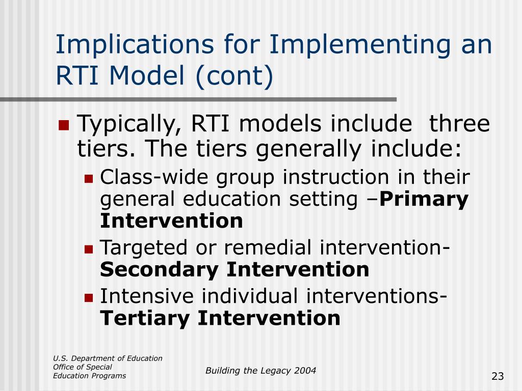 Implications for Implementing an RTI Model (cont) • OSEP does not take a position on: • a specific number of tiers within an RTI model • the slope of progress or absolute level of achievement that determines movement between tiers • whether or not an RTI process includes special education as a component of the tier system Building the Legacy 2004