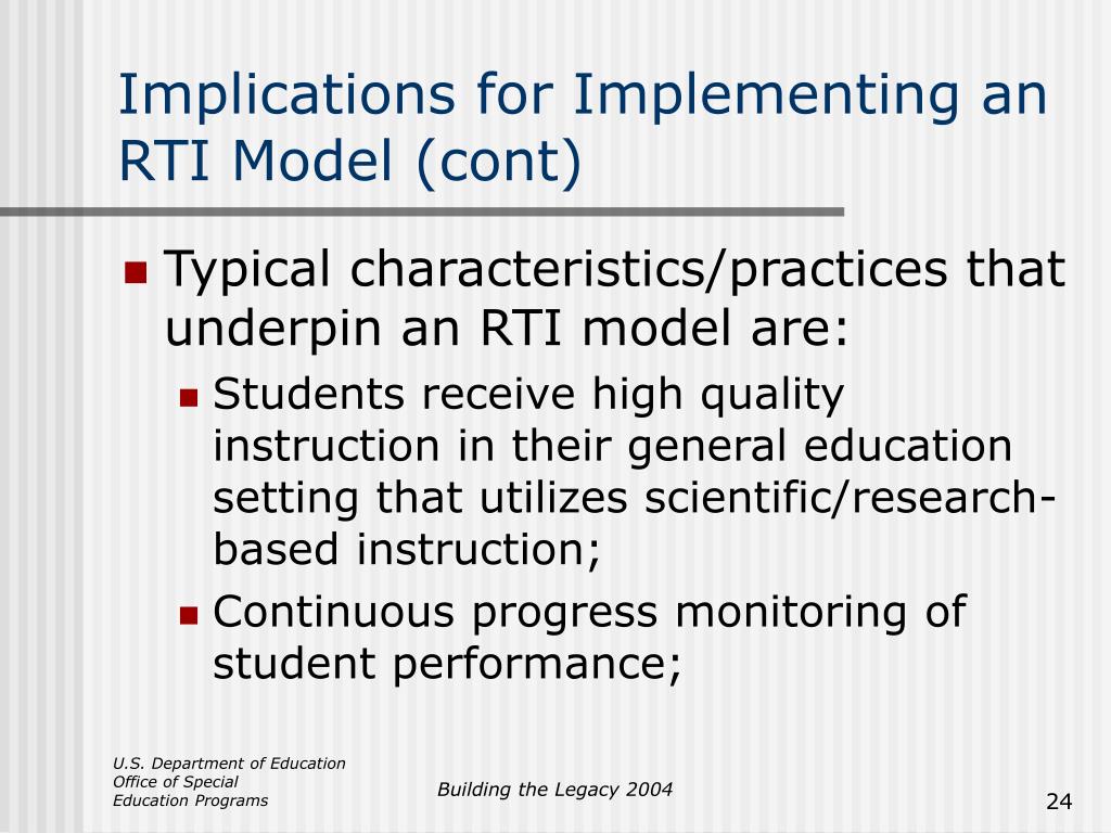 Implications for Implementing an RTI Model (cont) • Typical characteristics/practices that underpin an RTI model are: • Students receive high quality instruction in their general education setting that utilizes scientific/research-based instruction; • Continuous progress monitoring of student performance; Building the Legacy 2004