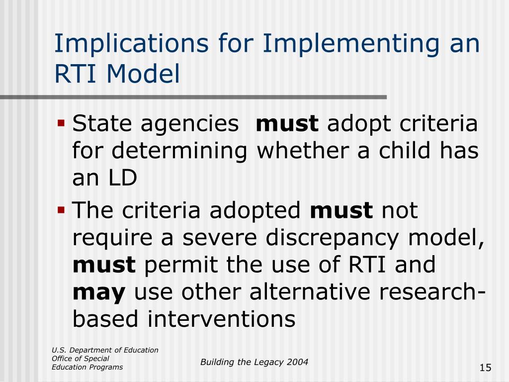 Implications for Implementing an RTI Model • State agencies must adopt criteria for determining whether a child has an LD • The criteria adopted must not requirea severe discrepancy model, must permit the use of RTI and may use other alternative research-based interventions Building the Legacy 2004
