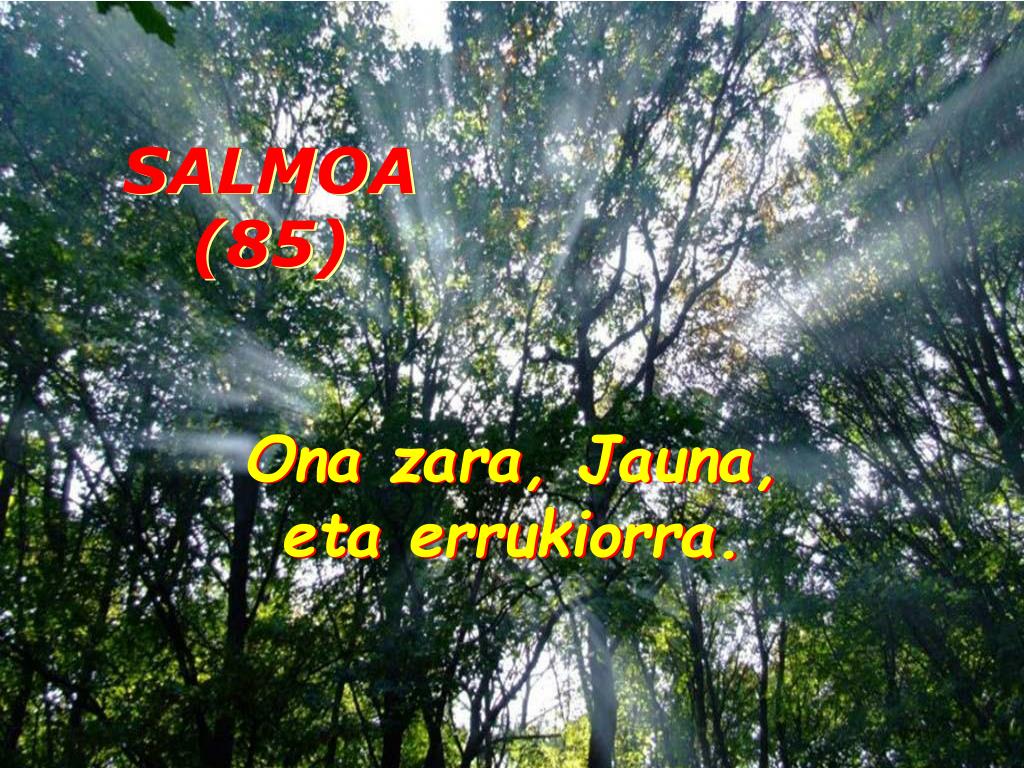 URTEAN ZEHAR 16. domeka. SALMOA (85). Ona zara, Jauna, eta errukiorra. Ona zara, Jauna, eta errukiorra. Ona zara, Jauna, eta errukiorra, deitzen deutsuen guztientzat maitasunez betea. Entzun, Jauna, nire otoitza, aditu nire eskariaren hotsa. Ona zara, Jauna, eta errukiorra.