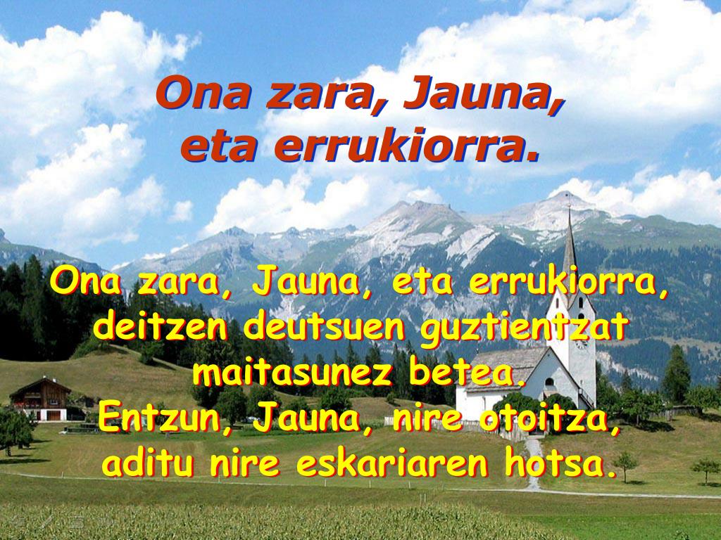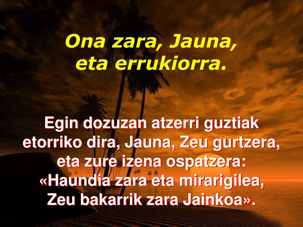 Ona zara, Jauna, eta errukiorra. Ona zara, Jauna, eta errukiorra, deitzen deutsuen guztientzat maitasunez betea. Entzun, Jauna, nire otoitza, aditu nire eskariaren hotsa.