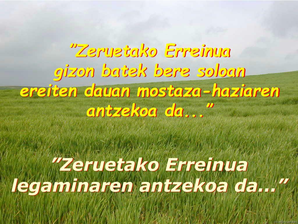”Zeruetako Erreinua gizon batek bere soloan ereiten dauan mostaza-haziaren antzekoa da...” ”Zeruetako Erreinua legaminaren antzekoa da...”