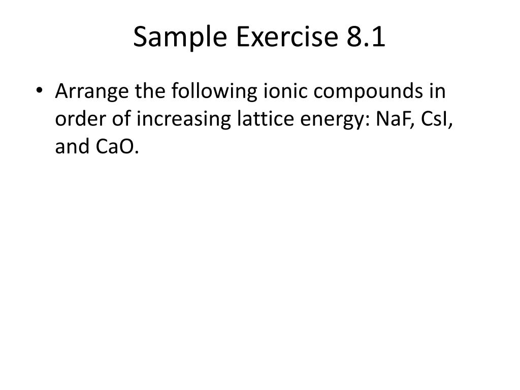 Sample Exercise 8.1 • Arrange the following ionic compounds in order of increasing lattice energy: NaF, CsI, and CaO.