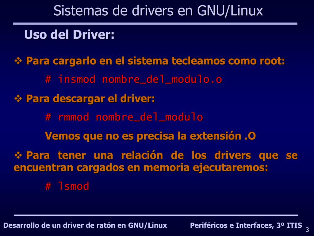 Desarrollo de un driver de ratón en GNU/Linux. Desarrollo de un driver de ratón en GNU/Linux Periféricos e Interfaces, 3º ITIS. 2. Sistemas de drivers en GNU/Linux.
