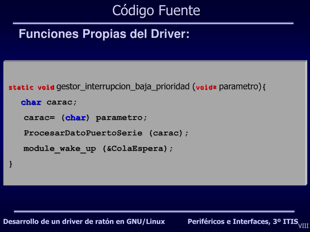 VII Código Fuente static voidgestor_interrupcion(intirq,void*dev_id,struct pt_regs *regs){ staticchar caracter; staticstruct tq_struct tarea= { NULL, 0, gestor_interrupcion_baja_prioridad, &caracter }; // Mientras haya un Data Ready (DR) en LSR... while ((inb(LSR)&0x1) !=0){ caracter= inb(RBR); tarea.data= (void *) caracter; queue_task (&tarea, &tq_immediate); // Metemos en la cola de tareas el caracter recien leido mark_bh (IMMEDIATE_BH); // Avisamos a la cola de que tiene una tarea por procesar }} Funciones Propias del Driver: Desarrollo de un driver de ratón en GNU/Linux Periféricos e Interfaces, 3º ITIS