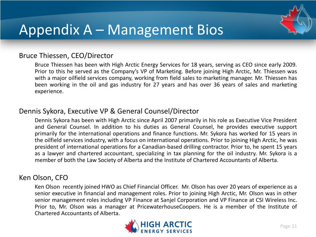 Appendix A – Management Bios Bruce Thiessen, CEO/Director Bruce Thiessen has been with High Arctic Energy Services for 18 years, serving as CEO since early 2009. Prior to this he served as the Company’s VP of Marketing. Before joining High Arctic, Mr. Thiessen was with a major oilfield services company, working from field sales to marketing manager. Mr. Thiessen has been working in the oil and gas industry for 27 years and has over 36 years of sales and marketing experience. Dennis Sykora, Executive VP & General Counsel/Director Dennis Sykora has been with High Arctic since April 2007 primarily in his role as Executive Vice President and General Counsel. In addition to his duties as General Counsel, he provides executive support primarily for the international operations and finance functions. Mr. Sykora has worked for 15 years in the oilfield services industry, with a focus on international operations. Prior to joining High Arctic, he was president of international operations for a Canadian-based drilling contractor. Prior to, he spent 15 years as a lawyer and chartered accountant, specializing in tax planning for the oil industry. Mr. Sykora is a member of both the Law Society of Alberta and the Institute of Chartered Accountants of Alberta. Ken Olson, CFO Ken Olson recently joined HWO as Chief Financial Officer. Mr. Olson has over 20 years of experience as a senior executive in financial and management roles. Prior to joining High Arctic, Mr. Olson was in other senior management roles including VP Finance at Sanjel Corporation and VP Finance at CSI Wireless Inc. Prior to, Mr. Olson was a manager at PricewaterhouseCoopers. He is a member of the Institute of Chartered Accountants of Alberta.