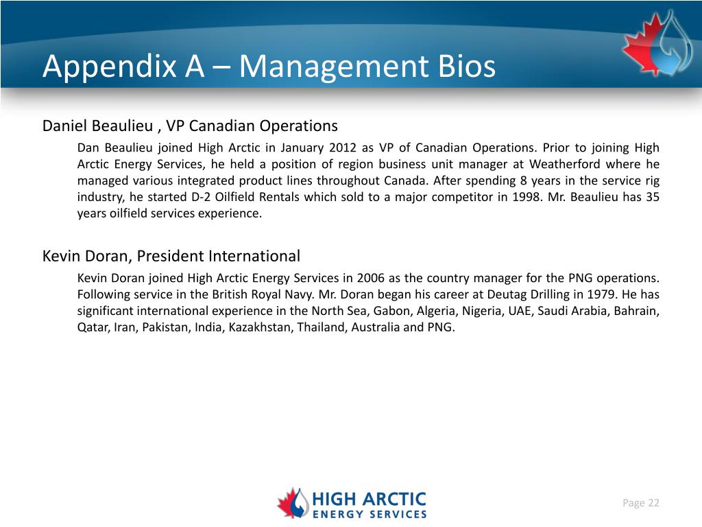 Appendix A – Management Bios Daniel Beaulieu , VP Canadian Operations Dan Beaulieu joined High Arctic in January 2012 as VP of Canadian Operations. Prior to joining High Arctic Energy Services, he held a position of region business unit manager at Weatherford where he managed various integrated product lines throughout Canada. After spending 8 years in the service rig industry, he started D-2 Oilfield Rentals which sold to a major competitor in 1998. Mr. Beaulieu has 35 years oilfield services experience. Kevin Doran, PresidentInternational Kevin Doran joined High Arctic Energy Services in 2006 as the country manager for the PNG operations. Following service in the British Royal Navy. Mr. Doran began his career at Deutag Drilling in 1979. He has significant international experience in the North Sea, Gabon, Algeria, Nigeria, UAE, Saudi Arabia, Bahrain, Qatar, Iran, Pakistan, India, Kazakhstan, Thailand, Australia and PNG.