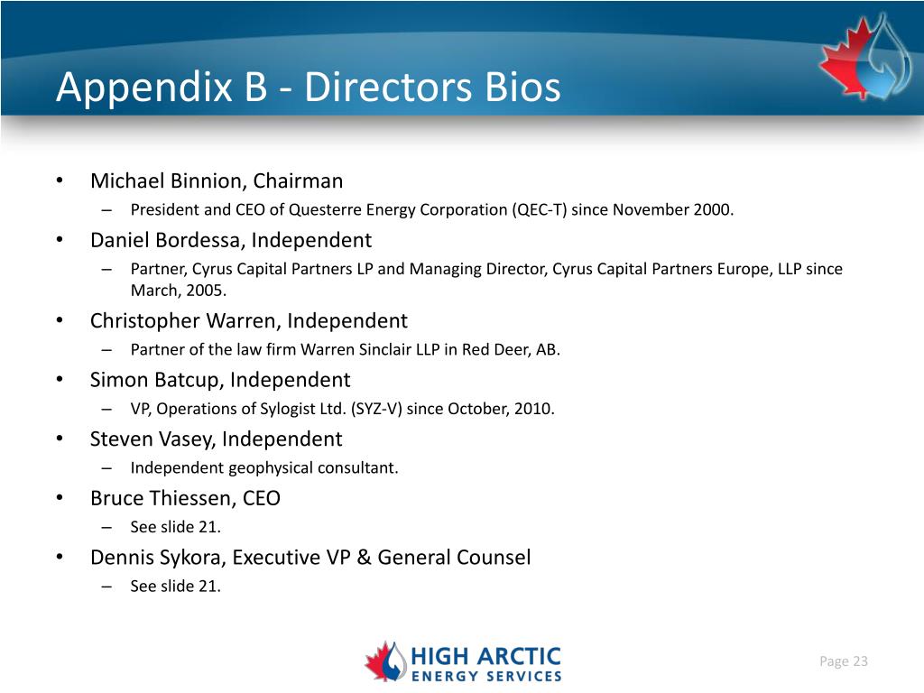 Appendix B - Directors Bios • Michael Binnion, Chairman • President and CEO of Questerre Energy Corporation (QEC-T) since November 2000. • Daniel Bordessa, Independent • Partner, Cyrus Capital Partners LP and Managing Director, Cyrus Capital Partners Europe, LLP since March, 2005. • Christopher Warren, Independent • Partner of the law firm Warren Sinclair LLP in Red Deer, AB. • Simon Batcup, Independent • VP, Operations of Sylogist Ltd. (SYZ-V) since October, 2010. • Steven Vasey, Independent • Independent geophysical consultant. • Bruce Thiessen, CEO • See slide 21. • Dennis Sykora, Executive VP & General Counsel • See slide 21.