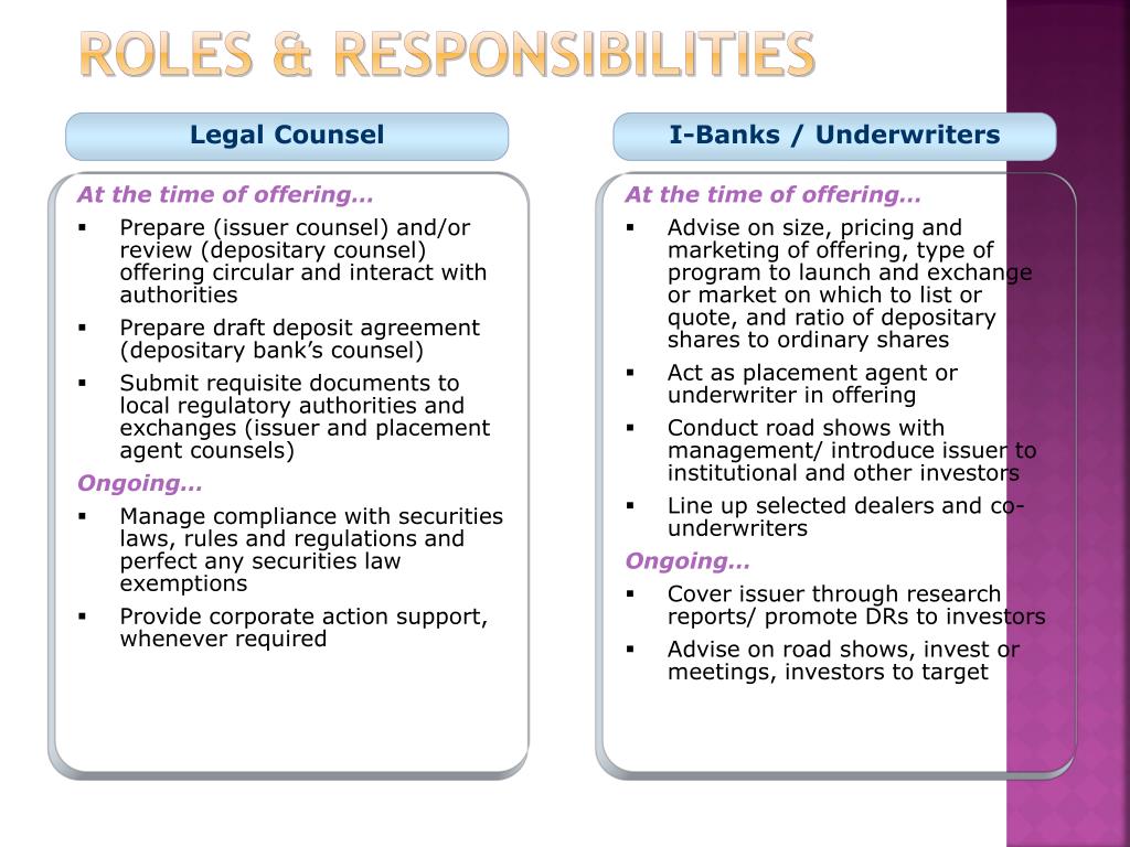 Roles & responsibilities Legal Counsel I-Banks / Underwriters At the time of offering… • Prepare (issuer counsel) and/or review (depositary counsel) offering circular and interact with authorities • Prepare draft deposit agreement (depositary bank’s counsel) • Submit requisite documents to local regulatory authorities and exchanges (issuer and placement agent counsels) Ongoing… • Manage compliance with securities laws, rules and regulations and perfect any securities law exemptions • Provide corporate action support, whenever required At the time of offering… • Advise on size, pricing and marketing of offering, type of program to launch and exchange or market on which to list or quote, and ratio of depositary shares to ordinary shares • Act as placement agent or underwriter in offering • Conduct road shows with management/ introduce issuer to institutional and other investors • Line up selected dealers and co-underwriters Ongoing… • Cover issuer through research reports/ promote DRs to investors • Advise on road shows, invest or meetings, investors to target