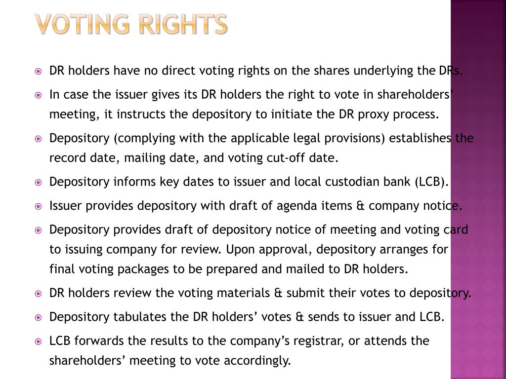 Voting rights • DR holders have no direct voting rights on the shares underlying the DRs. • In case the issuer gives its DR holders the right to vote in shareholders’ meeting, it instructs the depository to initiate the DR proxy process. • Depository (complying with the applicable legal provisions) establishes the record date, mailing date, and voting cut-off date. • Depository informs key dates to issuer and local custodian bank (LCB). • Issuer provides depository with draft of agenda items & company notice. • Depository provides draft of depository notice of meeting and voting card to issuing company for review. Upon approval, depository arranges for final voting packages to be prepared and mailed to DR holders. • DR holders review the voting materials & submit their votes to depository. • Depository tabulates the DR holders’ votes & sends to issuer and LCB. • LCB forwards the results to the company’s registrar, or attends the shareholders’ meeting to vote accordingly.