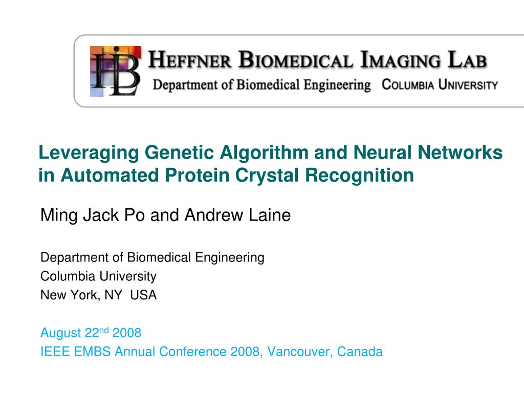 Leveraging Genetic Algorithm and Neural Networks in Automated Protein Crystal Recognition Ming Jack Po and Andrew Laine Department of Biomedical Engineering Columbia University New York, NY USA August 22nd 2008 IEEE EMBS Annual Conference 2008, Vancouver, Canada