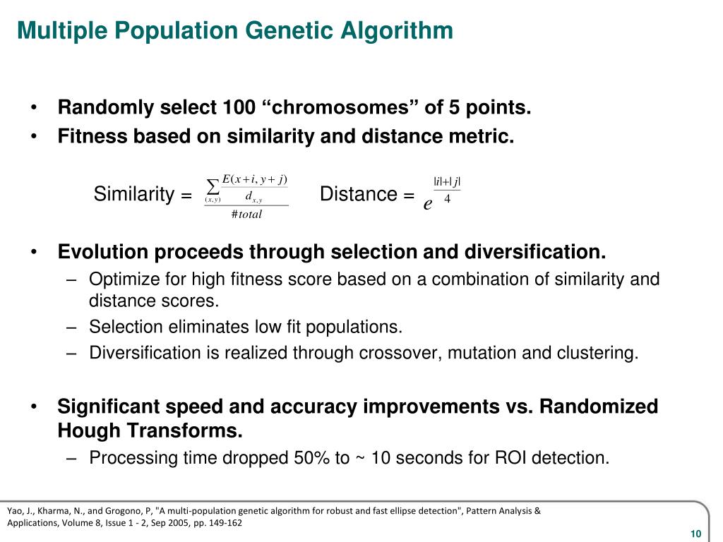 Multiple Population Genetic Algorithm • Randomly select 100 “chromosomes” of 5 points. • Fitness based on similarity and distance metric. • Similarity = Distance = • Evolution proceeds through selection and diversification. • Optimize for high fitness score based on a combination of similarity and distance scores. • Selection eliminates low fit populations. • Diversification is realized through crossover, mutation and clustering. • Significant speed and accuracy improvements vs. Randomized Hough Transforms. • Processing time dropped 50% to ~ 10 seconds for ROI detection. Yao, J., Kharma, N., and Grogono, P, "A multi-population genetic algorithm for robust and fast ellipse detection", Pattern Analysis & Applications, Volume 8, Issue 1 - 2, Sep 2005, pp. 149-162