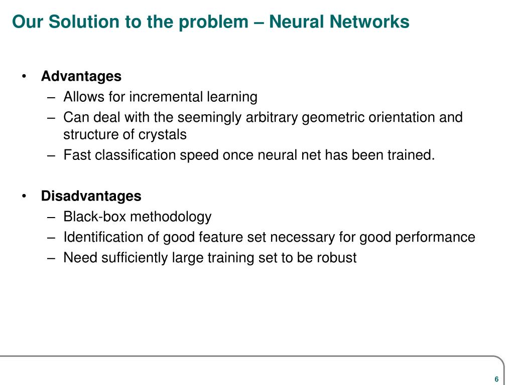 Our Solution to the problem – Neural Networks • Advantages • Allows for incremental learning • Can deal with the seemingly arbitrary geometric orientation and structure of crystals • Fast classification speed once neural net has been trained. • Disadvantages • Black-box methodology • Identification of good feature set necessary for good performance • Need sufficiently large training set to be robust