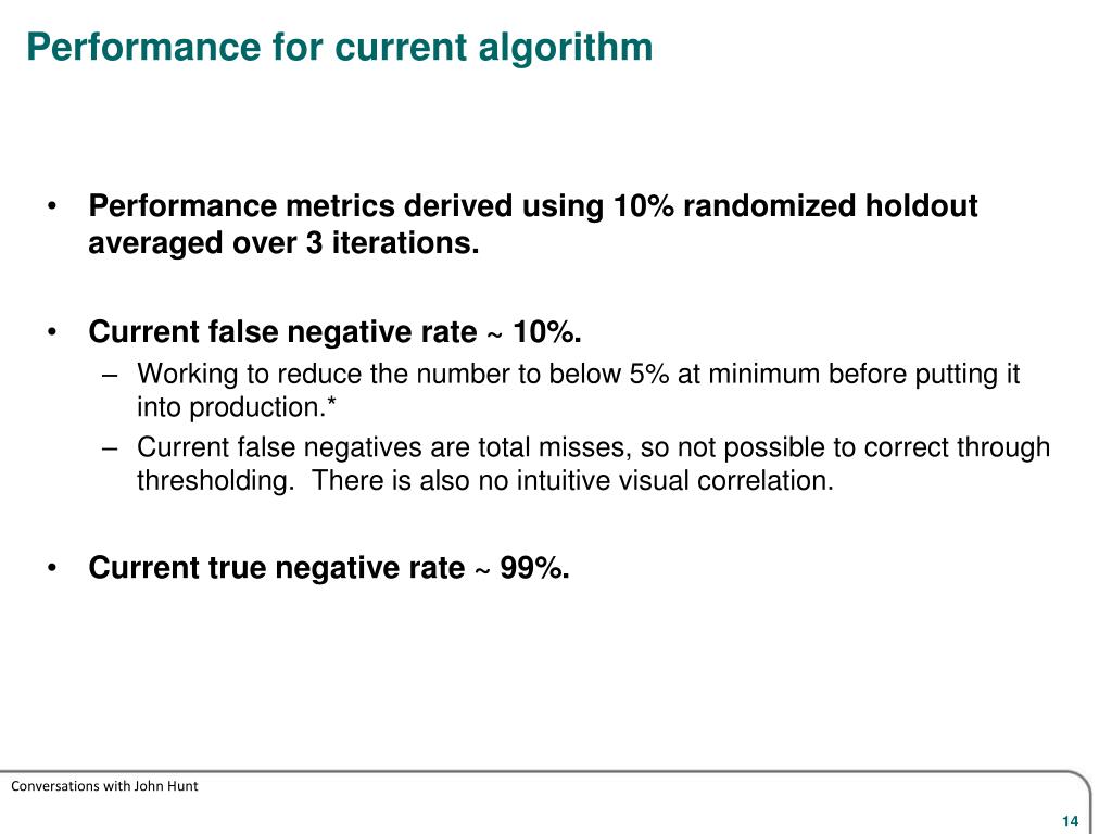 Performance for current algorithm • Performance metrics derived using 10% randomized holdout averaged over 3 iterations. • Current false negative rate ~ 10%. • Working to reduce the number to below 5% at minimum before putting it into production.* • Current false negatives are total misses, so not possible to correct through thresholding. There is also no intuitive visual correlation. • Current true negative rate ~ 99%. Conversations with John Hunt
