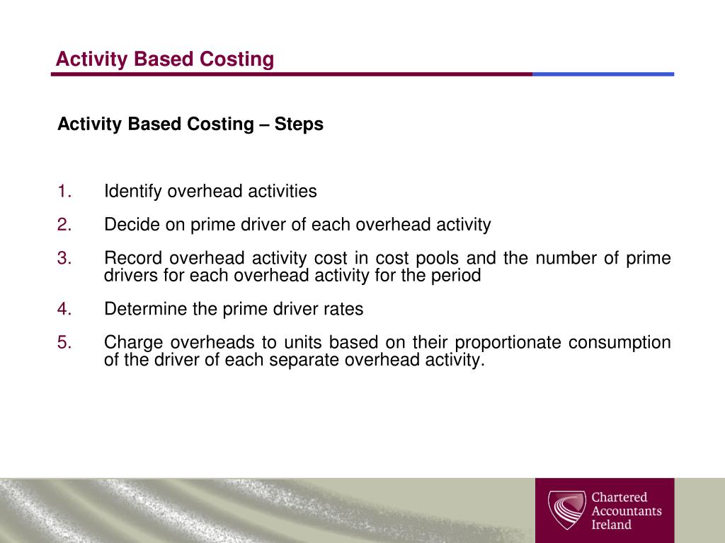 Activity Based Costing Activity Based Costing – Steps • Identify overhead activities • Decide on prime driver of each overhead activity • Record overhead activity cost in cost pools and the number of prime drivers for each overhead activity for the period • Determine the prime driver rates • Charge overheads to units based on their proportionate consumption of the driver of each separate overhead activity.