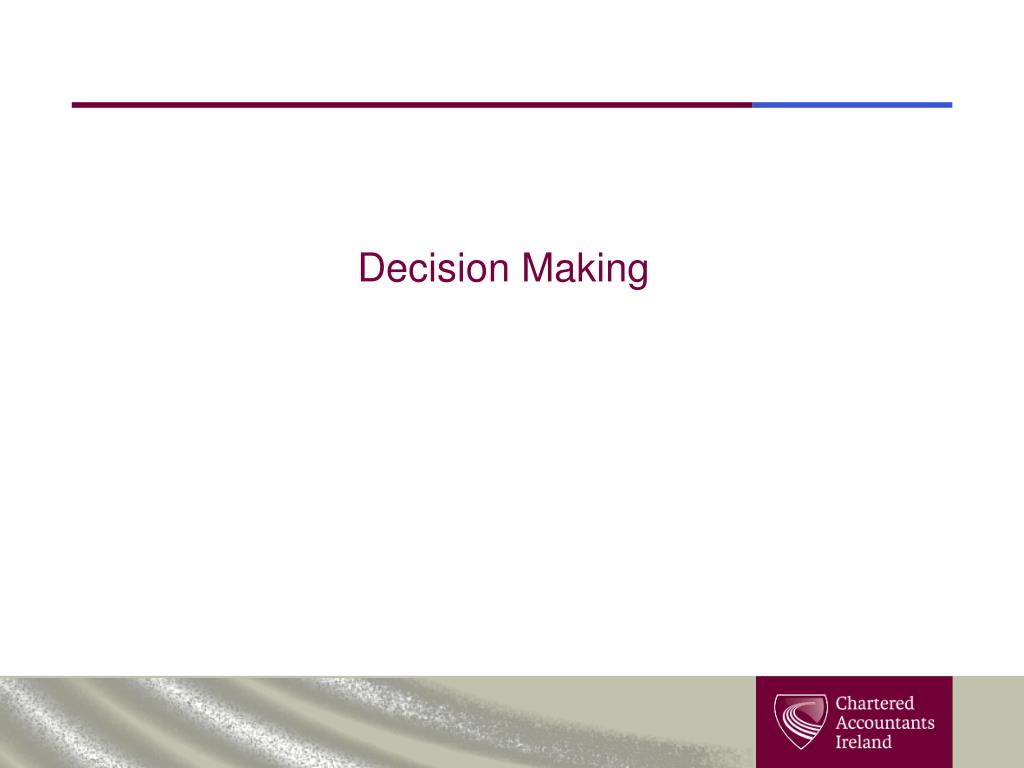 Decision Making Steps in the decision making process • Accountant carries out the quantitative analysis based on relevant costing principles. • Accountant presents the quantitative analysis (future incremental cashflows) • Accountant contributes to the wider debate considering the qualitative factors i.e. the decision’s potential impact on the various stakeholder groups • The ultimate decision is made and implemented
